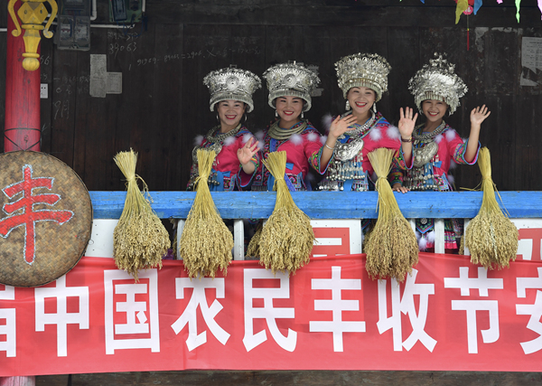 这是9月22日拍摄的苗家姑娘。 当日,广西融水苗族自治县安陲乡乌吉村举行庆丰收祈福仪式,村民们挑着丰收的农作物,吹奏芦笙、跳芒哥舞,庆贺丰收。
