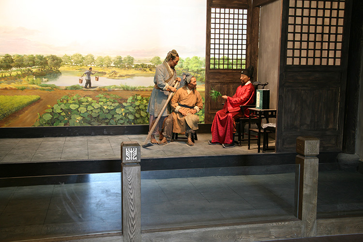坐在桑基鱼塘背景油画前的是明末著名农学家徐光启,他所写的《农政全书》对中国传统农业生产经验进行了总结,是我国农业技术史上的一部不朽巨著,与《氾(fàn)胜之书》、《齐民要术》、《王祯农书》并称为四大农书。内容基本上囊括了古代农业生产和人民生活的各个方面,而其中又贯穿着一个基本思想,即徐光启的治国治民的“农政”思想。这是其他的大型农书所鲜见的。