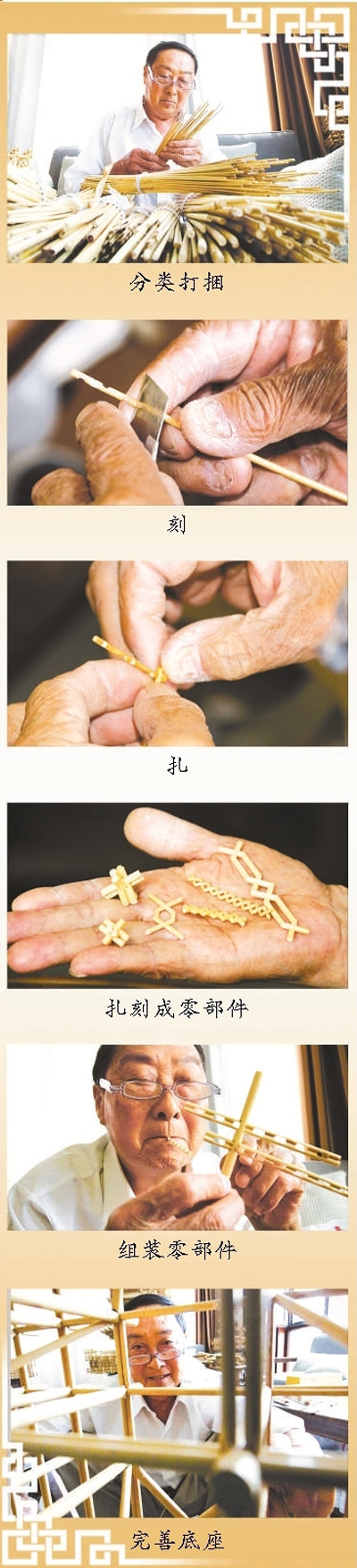 “所有扎刻作品的骨架都是由六根高粱秆锁扣而成,将锁好的秆从下往上、从里往外,一层层做起来,就像盖房子。”徐艳丰介绍,“扎刻的关键是尺寸要掌握好。每根秆的直径都用游标卡尺一一校对,误差不能超过0.3毫米。高粱秆不可能个个笔直,你看现在的梁柱都是笔直的,那是因为在扎刻之前,用酒精灯一一烤直的。秆直且一样粗,扎刻出的作品才会整齐。而且这样装上的每扇门和窗才能够打得开、关得上。”
