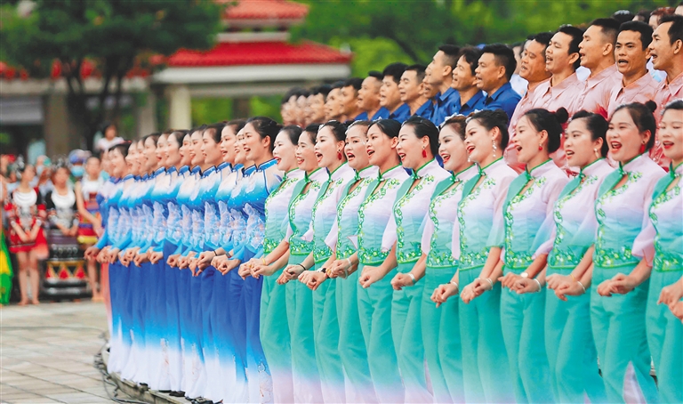 9月23日,“中国农民丰收节”海南庆祝活动在儋州市文化广场举行,本次活动以“庆丰收 感党恩”为主题。图为在当天举办的“千人调声颂党恩”农民丰收歌会上,农民朋友们通过调声表达丰收喜悦。海南日报记者 陈元才 摄