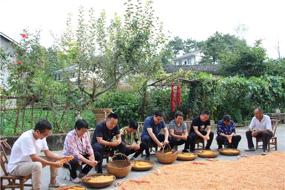粉色玫瑰镶在蔚蓝天幕下,猕猴桃密密匝匝,八月瓜咧嘴欢笑,甜杮子树弯着腰。龙池村周述耀的院坝里,晒着金灿灿的苞谷。