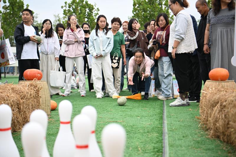 9月23日,在天津市北辰区西堤头镇曙光水镇,游客体验“南瓜保龄球”农趣活动。
