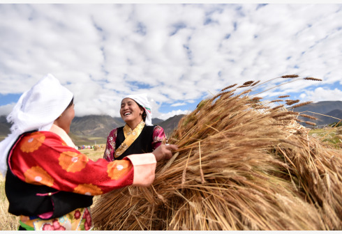 9月23日,拉萨市林周县松盘乡松盘村两名藏族农民在麦子堆旁聊天。当日是首个中国农民丰收节。西藏拉萨市林周县松盘乡松盘村举行节日庆祝活动。 新华社记者 觉果 摄