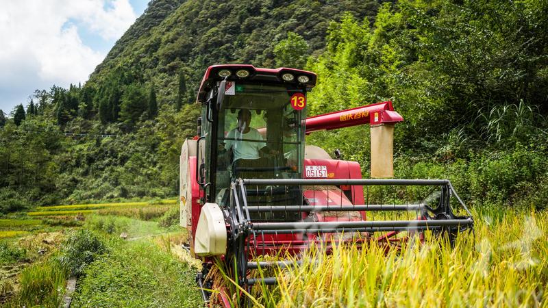 农机在长顺县长寨街道中塘村收割水稻(9月17日摄)。